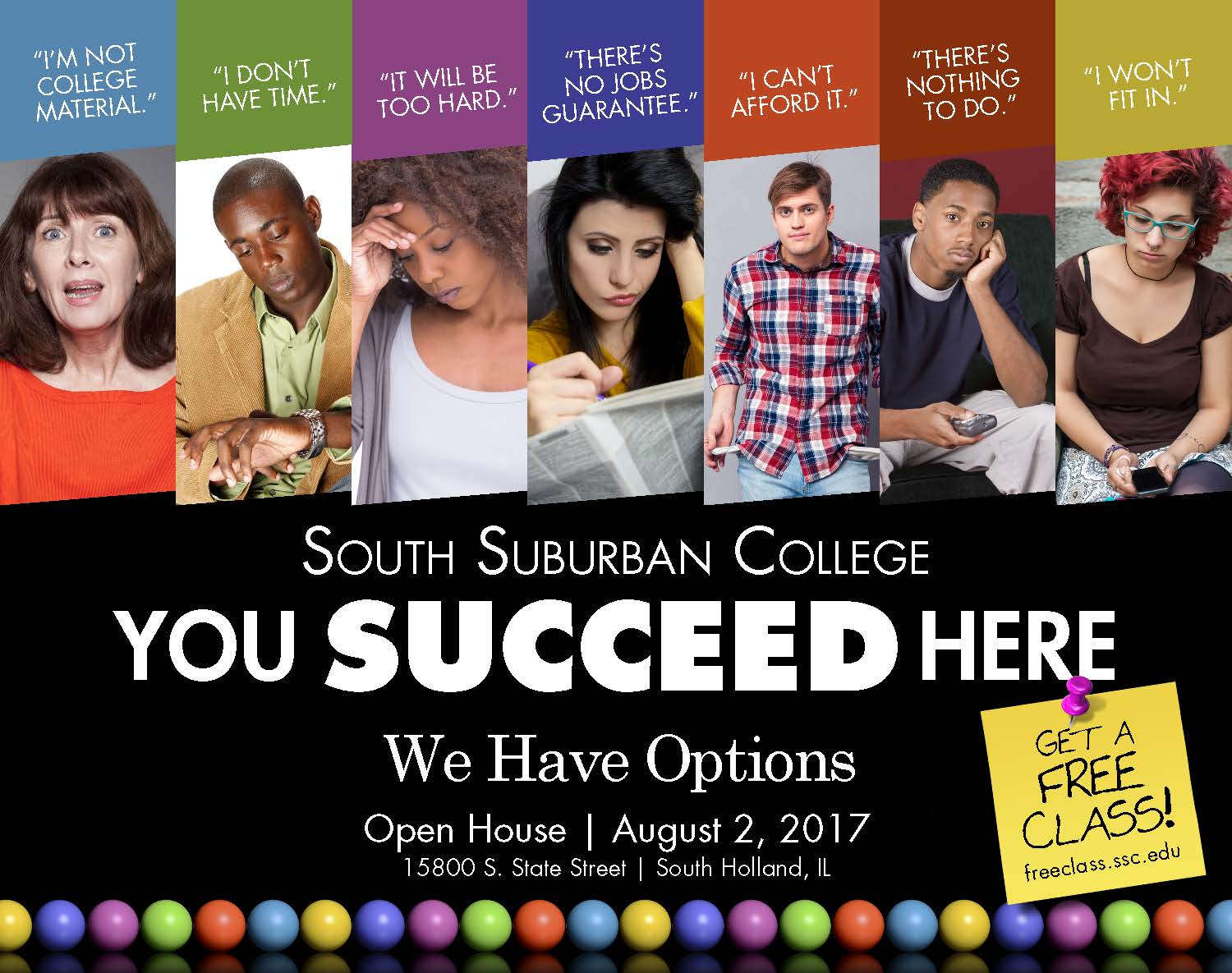 ASSIGNMENT: Create an ad campaign for a community college that addresses the top excuses that recruiters hear when speaking to potential students. Locate stock photography that reflects the diversity of students being solicited. Carry over the typefaces and color scheme of the current “sphere theme” currently in use.