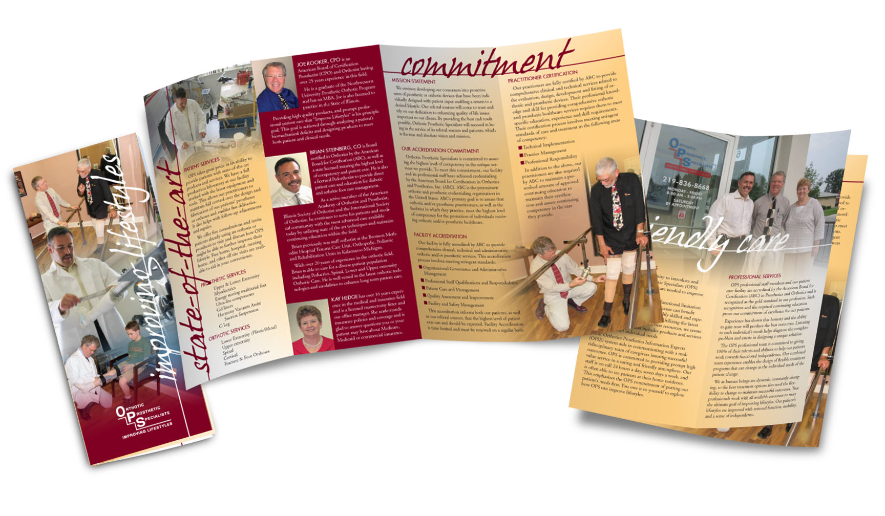 ASSIGNMENT: Produce a full-color brochure featuring the facility and staff of a local orthopedics and prosthetics business. Photograph the staff and a patient in their environment. Select fonts and color theme to compliment the interior and “feel” of the company environment.